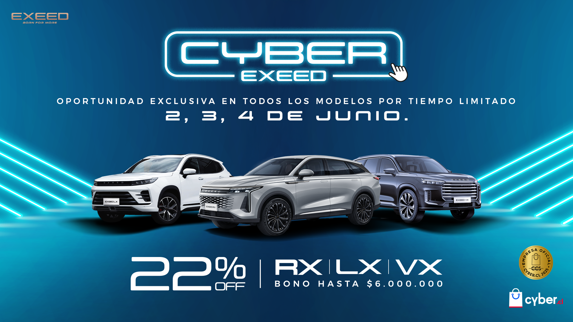 EXEED, la marca de alta gama que ha logrado un fuerte posicionamiento en el mercado chileno gracias a su propuesta de diseño, tecnología y seguridad, adelanta el Cyber con una campaña imperdible que ya está disponible desde este lunes 26 de mayo en su webstore oficial. Además, la marca se suma a las fechas oficiales del evento impulsado por la Cámara de Comercio de Santiago, que se desarrollará el 2, 3 y 4 de junio.