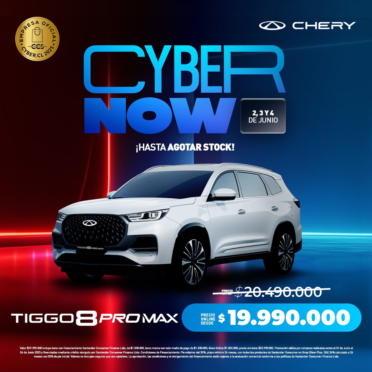 El buque insignia de CHERY, el Tiggo 8 PRO MAX se suma a la oferta disponible de modelos de la marca en el mayor evento de ventas digitales, Cyber Day. Entre el 2 y el 4 de junio estará disponible con las características que lo convierten en el favorito de quienes buscar un vehículo de tres corridas para 7 pasajeros y un diseño que redefine el lujo en su segmento. Los precios son insólitamente atractivos: de un valor base de $20.490.000 reduce su valor desde $19.990.000, que lo convierten en una excelente opción para quienes buscan un vehículo de grandes dimensiones a un valor muy conveniente.