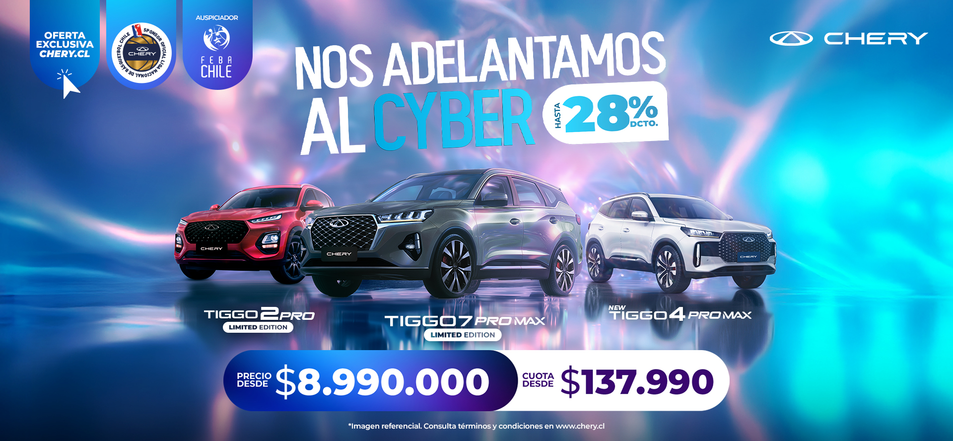 ¡Se acabó la espera! CHERY anunció que el Cyber llega primero a su tienda online, con precios especiales con hasta 28% de descuentos, además de atractivas condiciones de financiamiento de sus modelos más destacados: TIGGO 2, TIGGO 3, TIGGO 4 Y TIGGO 7. Hasta el 5 de octubre, en chery.cl estarán ofertas irresistibles para cotizar, reservar y comprar… en un solo paso.